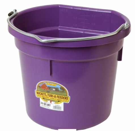 The Little Giant Flat Back Plastic Bucket is a favourite around the barn. The flat back makes hanging these buckets easy as they lay flat against the wall. They are also easier to carry. The Little Giant Flat Back Plastic Bucket is made from polyethylene resin that is impact resistant, protects against warpage, and helps prevent stress cracks. These buckets feature a heavy-duty metal bail with notch, so it hangs straight. These pails stack and come apart easily due to the stacking ribs. These buckets are available in a wide variety of colours so you can match your style, or tell your buckets apart from others.